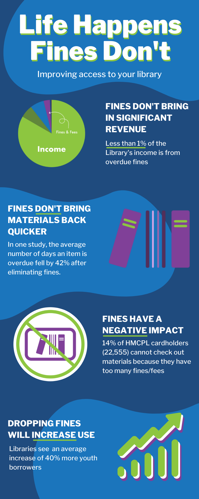 Many library members face fines, but for those without disposable income they can be difficult to pay. You can also see in our own community that lower income neighborhoods are disproportionately affected. 14% of HMCPL cardholders are blocked due to fines.
