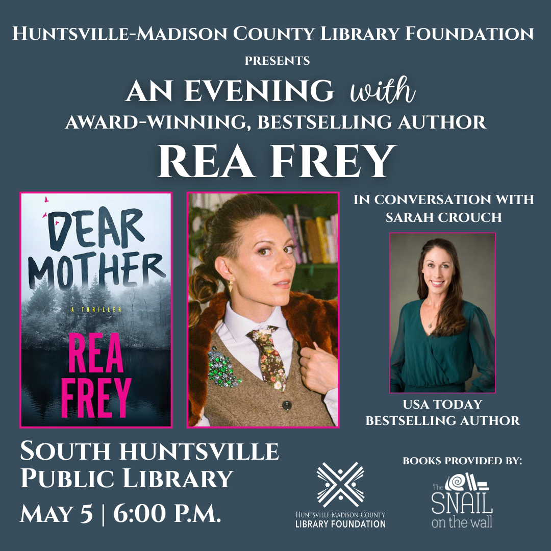 Join us at the South Huntsville Public Library for a discussion with Rea Frey, author of Dear Mother. Rea will be in conversation with fellow bestselling author, Sarah Crouch.