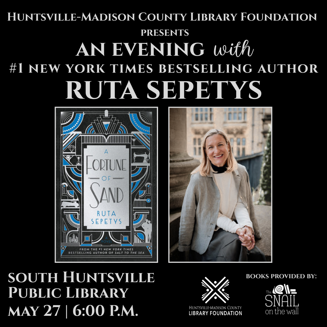 We are thrilled to welcome Ruta Sepetys to the South Huntsville Public Library to celebrate her new novel, A Fortune of Sand.