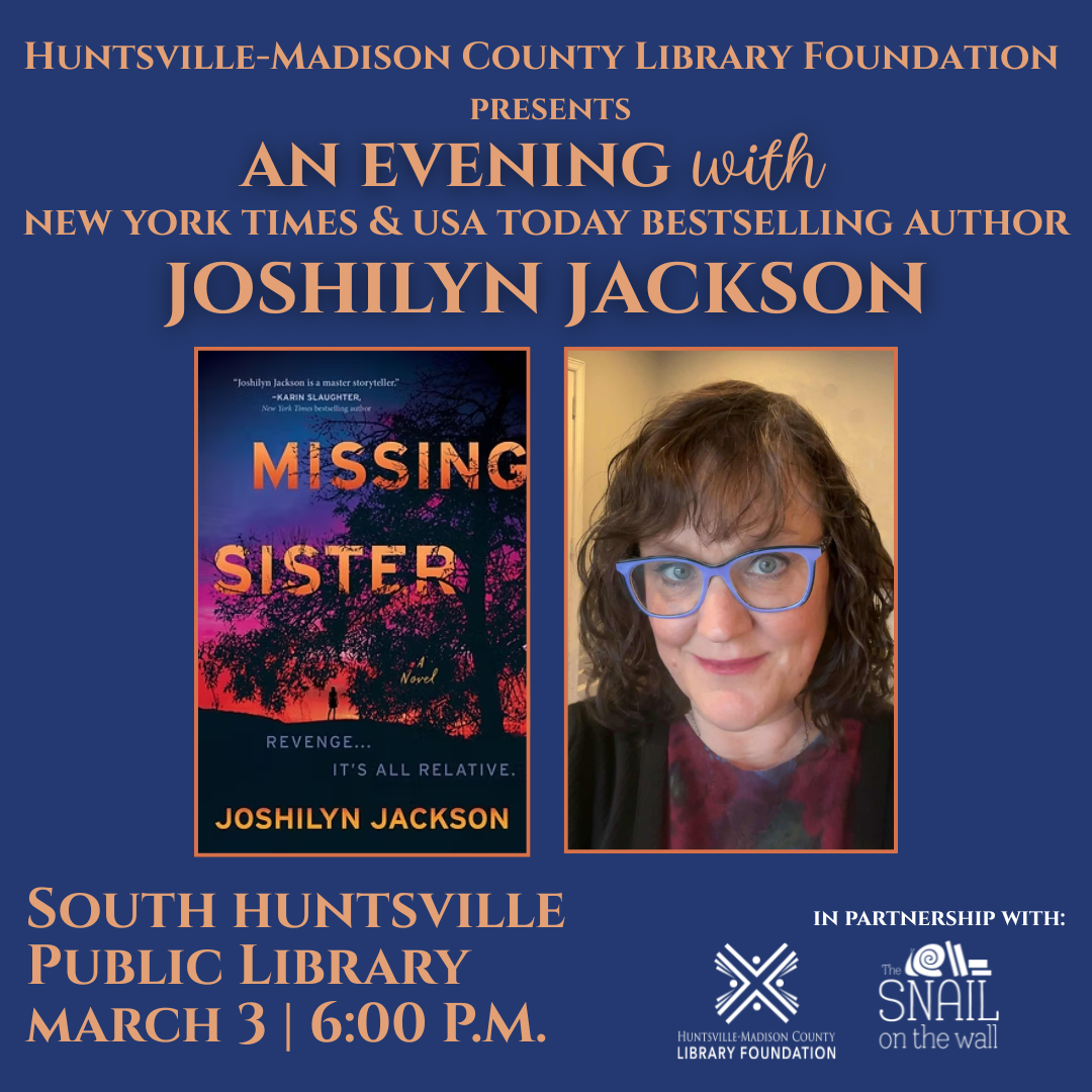 Join us at the South Huntsville Public Library for a discussion and book signing in celebration of Joshilyn Jackson's new novel, Missing Sister, on Tuesday, March 3, at 6:00 p.m.